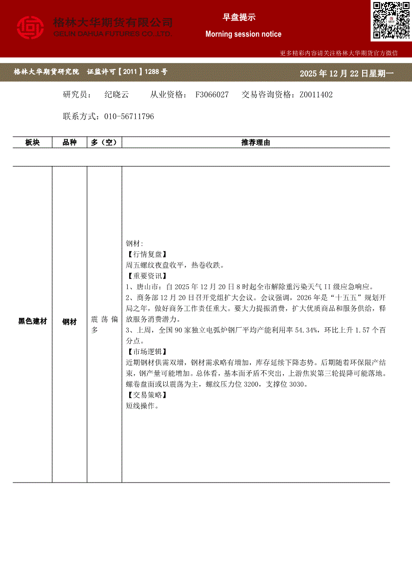 格林大华期货-一周简评:预计钢矿震荡走势-251220