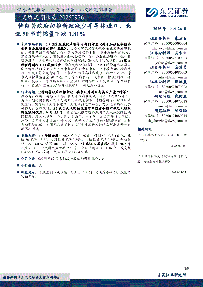 东吴证券-北交所定期报告:特朗普政府拟推新政减少半导体进口,北证50节前缩量下跌1.81%-250926