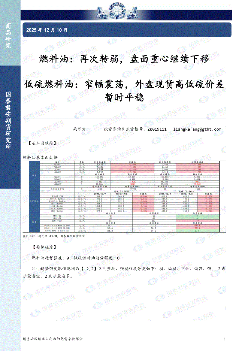 国泰君安期货-燃料油:再次转弱,盘面重心继续下移,低硫燃料油,窄幅震荡,外盘现货高低硫价差暂时平稳-251210