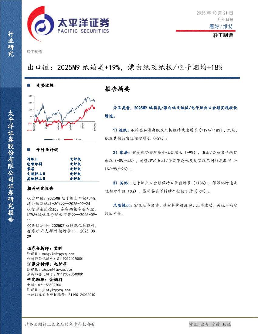 轻工制造行业:太平洋证券-轻工制造行业日报:出口链,2025M9纸箱类+19%,漂白纸及纸板/电子烟均+18%-251021
