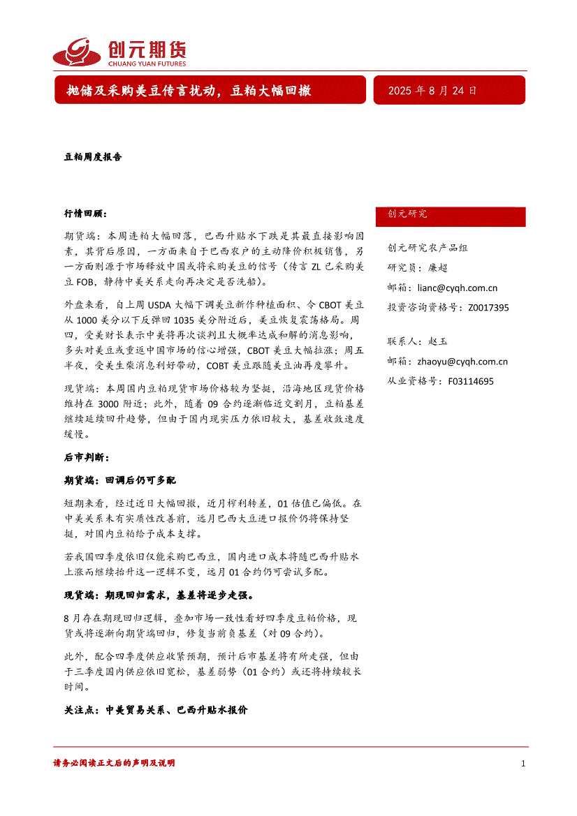 创元期货-豆粕周度报告:抛储及采购美豆传言扰动,豆粕大幅回撤-250824
