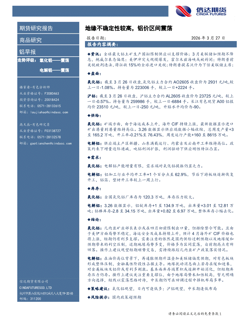信达期货-铝早报:地缘不确定性较高,铝价区间震荡-260327