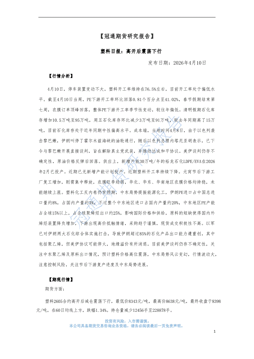 冠通期货-塑料日报:高开后震荡下行-260410