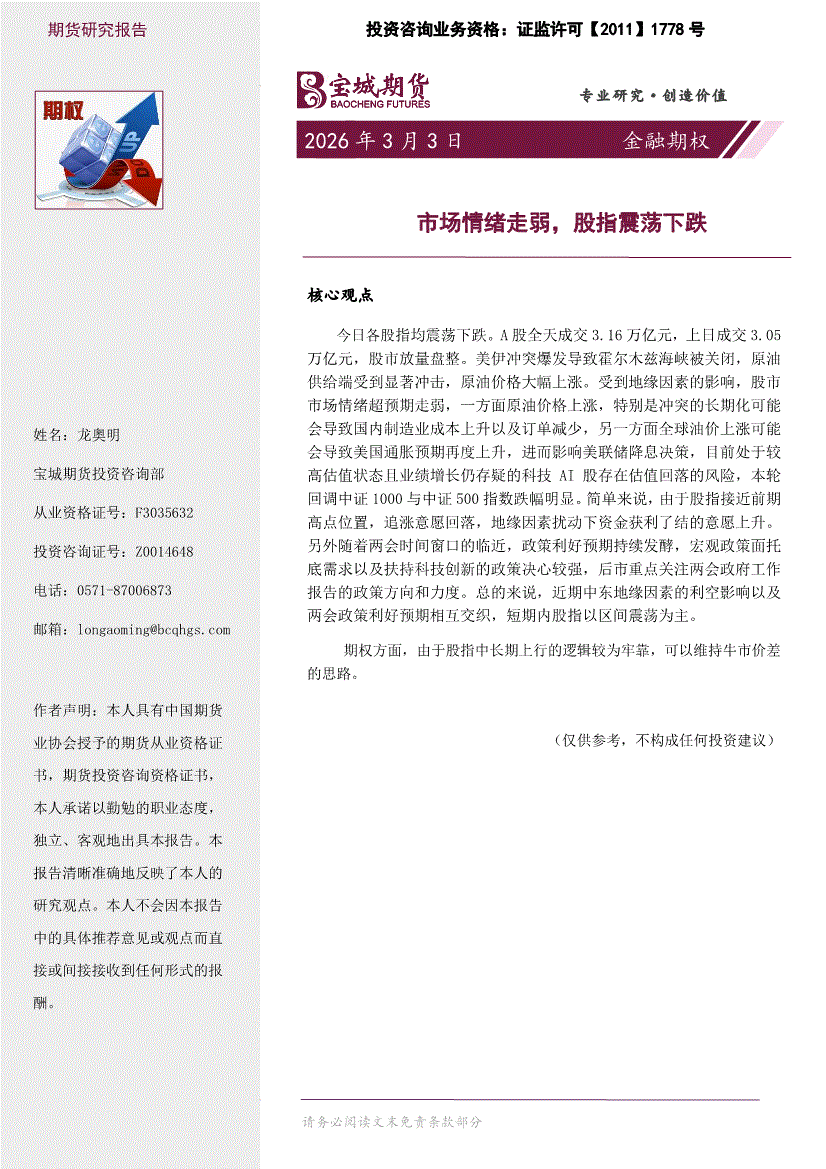 宝城期货-金融期权日报:市场情绪走弱,股指震荡下跌-260303