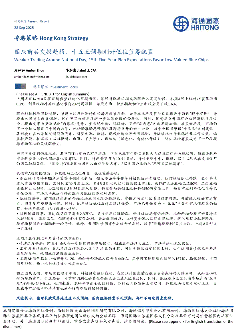 海通国际-香港策略:国庆前后交投趋弱,十五五预期利好低位蓝筹配置-250928