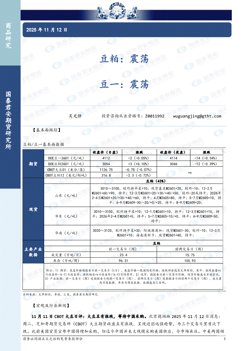国泰君安期货-豆粕:震荡,关注中方采购美豆情况,豆一,现货稳中偏强,盘面震荡-251116