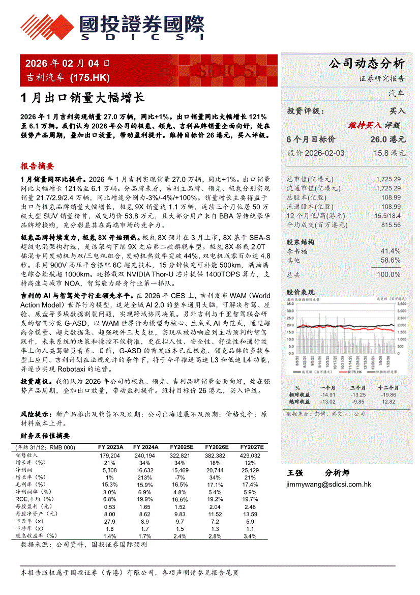吉利汽车:国投证券国际-吉利汽车-0175.HK-1月出口销量大幅增长-260204