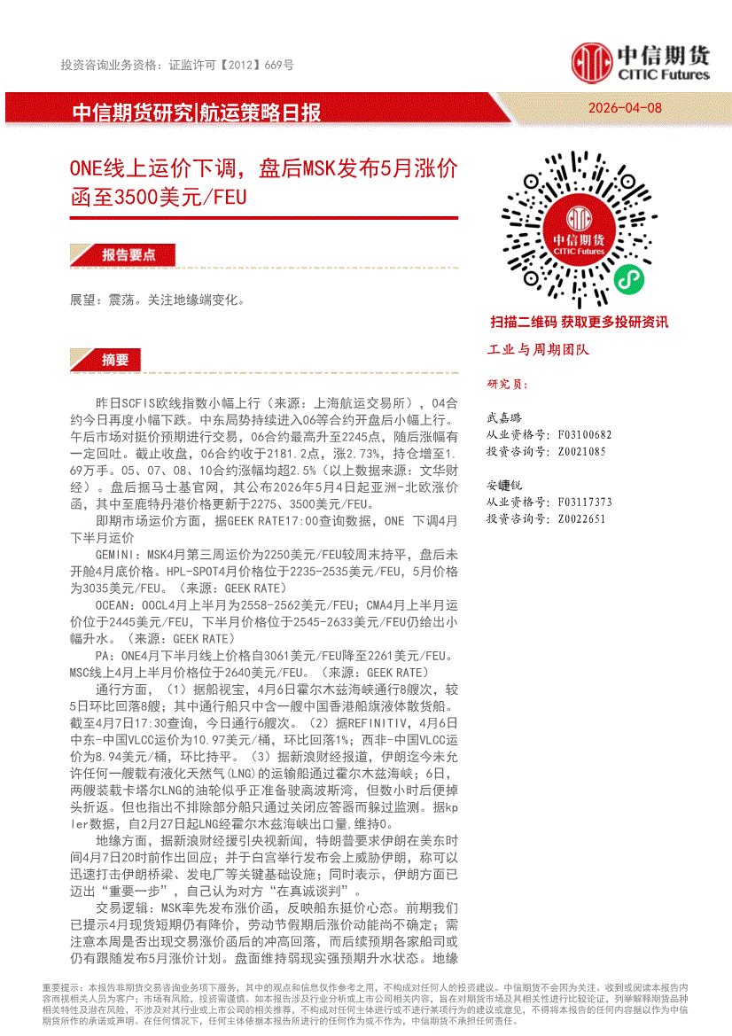 中信期货-航运策略日报:ONE线上运价下调,盘后MSK发布5月涨价函至3500美元/FEU-260408