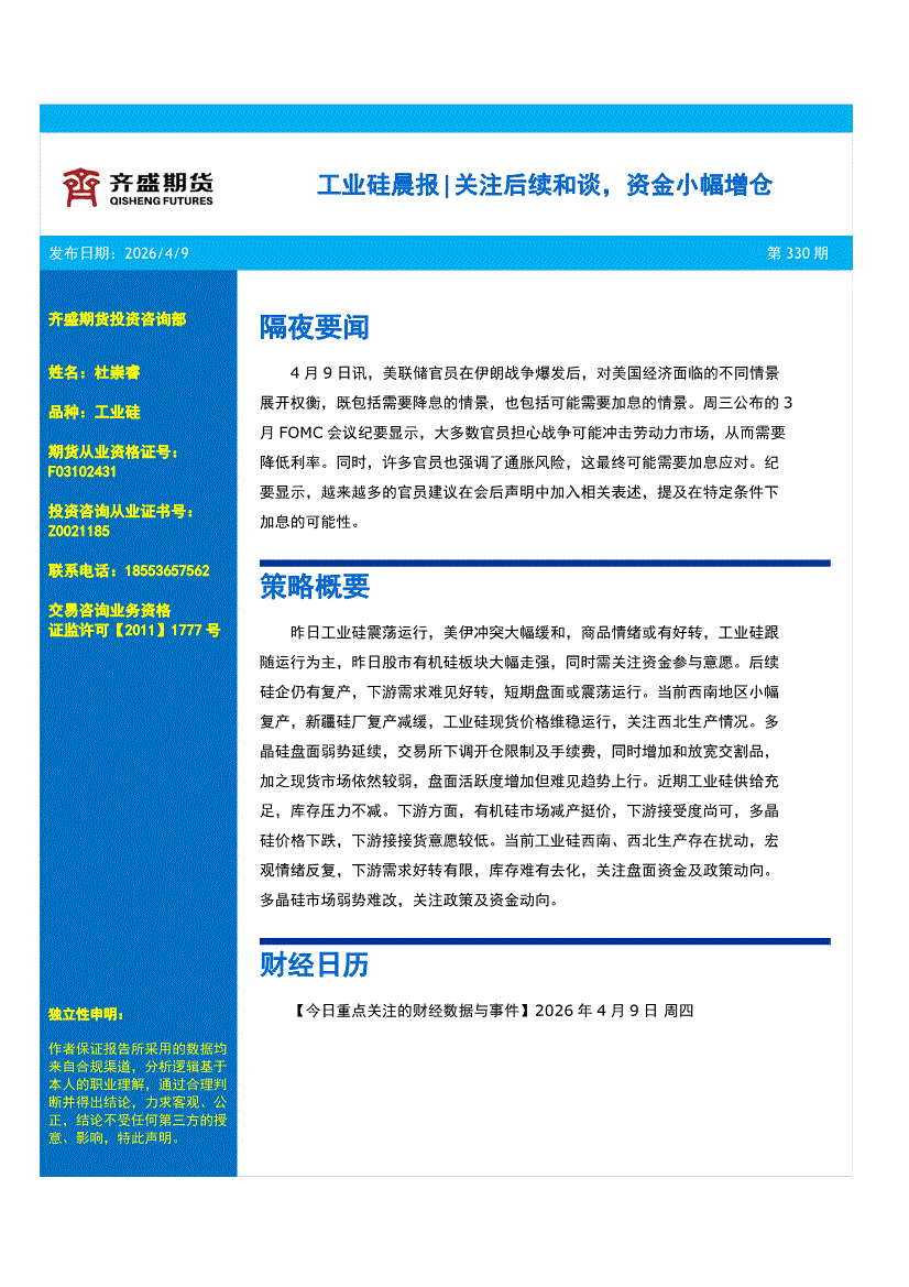 齐盛期货-工业硅晨报:关注后续和谈,资金小幅增仓-260409