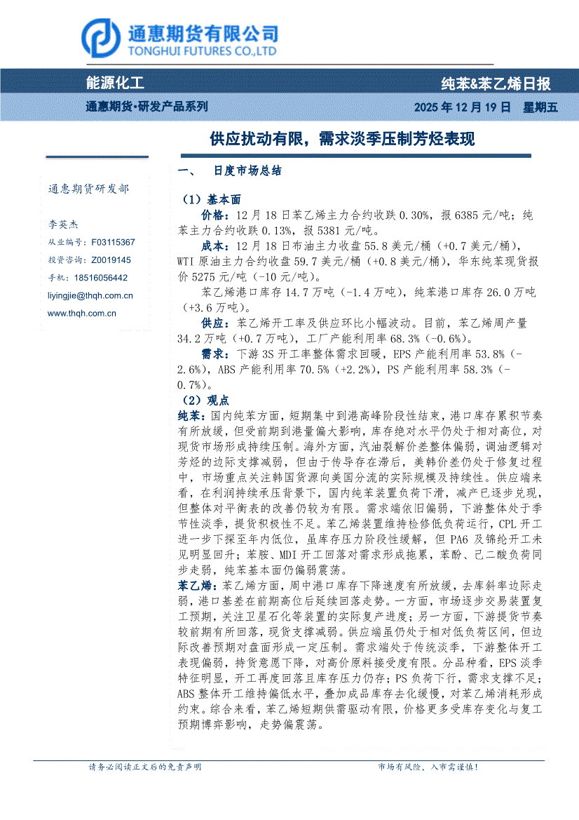 通惠期货-纯苯&苯乙烯日报:供应扰动有限,需求淡季压制芳烃表现-251219