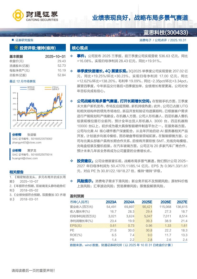 蓝思科技:财通证券-蓝思科技-300433-业绩表现良好,战略布局多景气赛道-251031