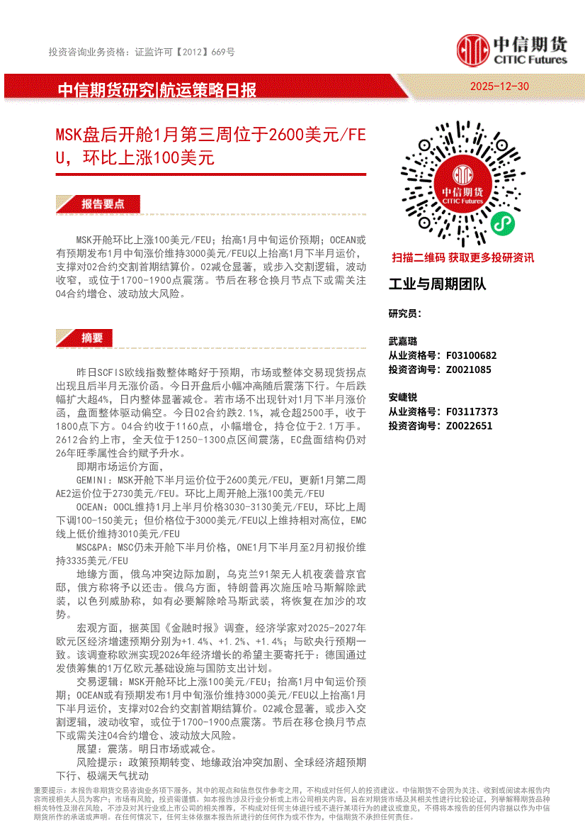 中信期货-航运策略日报:MSK盘后开舱1月第三周位于2600美元/FEU,环比上涨100美元-251230