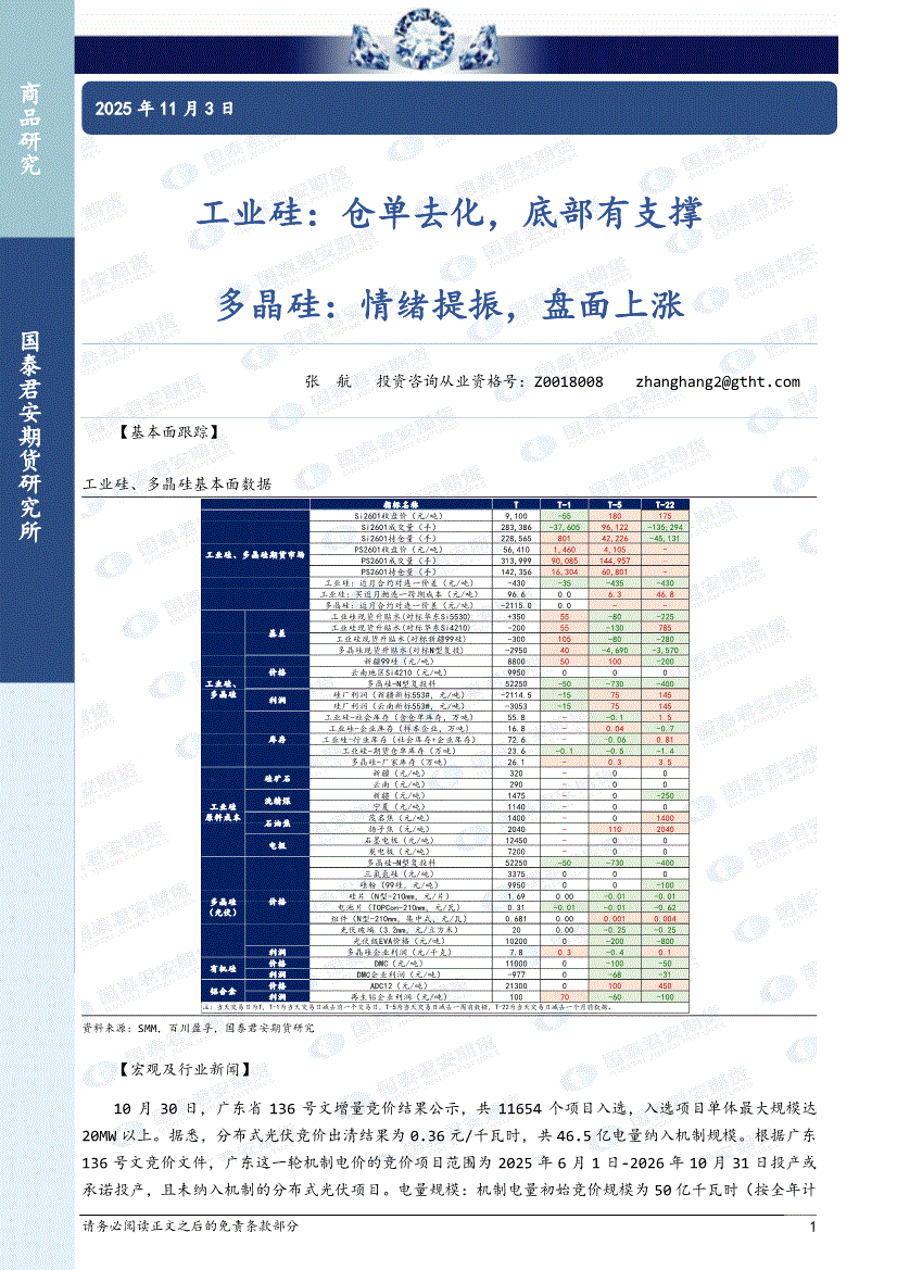 国泰君安期货-工业硅:仓单去化,底部有支撑,多晶硅,情绪提振,盘面上涨-251103