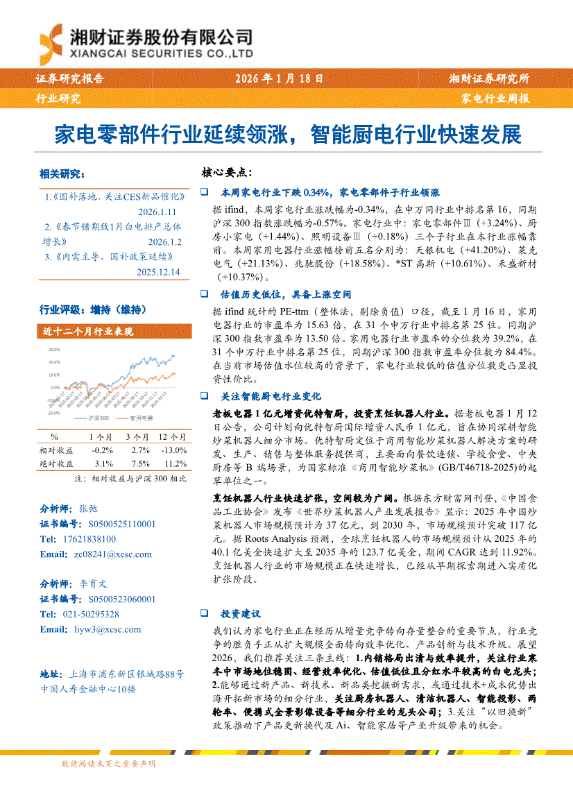 家电行业:湘财证券-家电行业周报:家电零部件行业延续领涨,智能厨电行业快速发展-260118