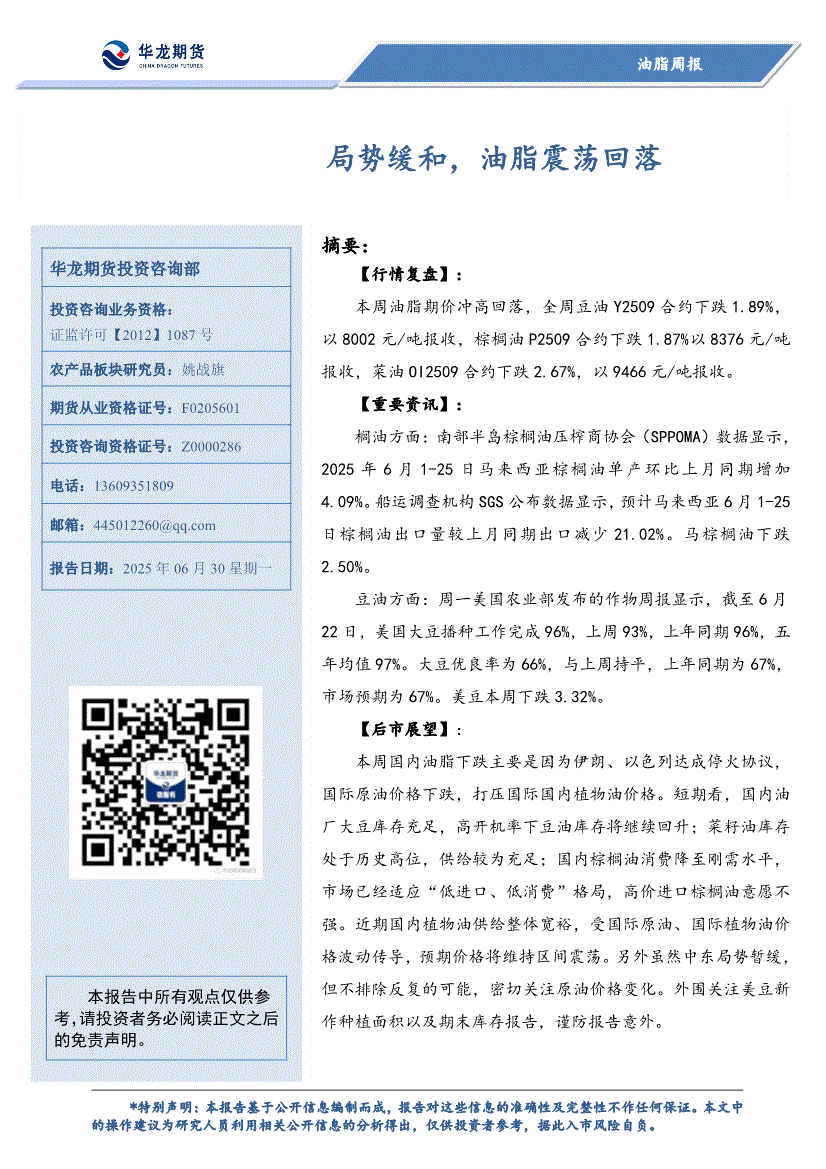 华龙期货-油脂周报:局势缓和,油脂震荡回落-250630