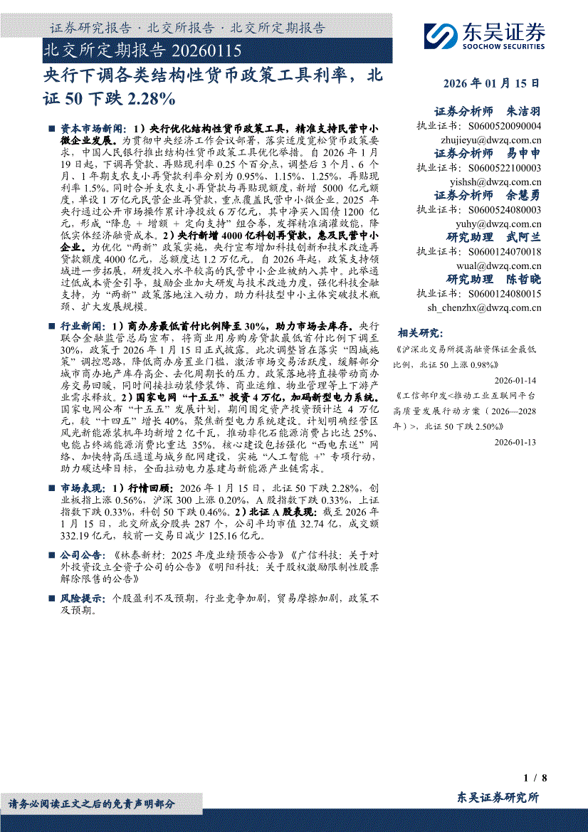 东吴证券-北交所定期报告:央行下调各类结构性货币政策工具利率,北证50下跌2.28%-260115