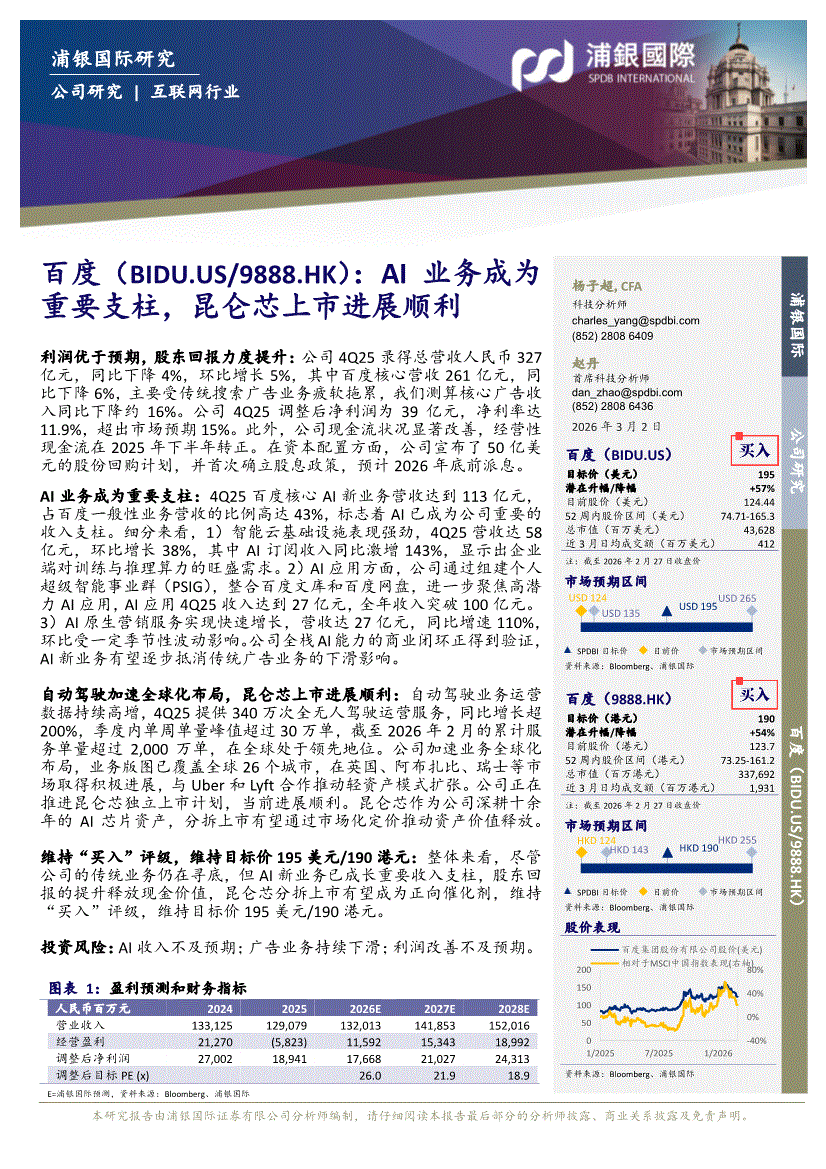 百度:浦银国际-百度-BIDU.US-AI业务成为重要支柱,昆仑芯上市进展顺利-260302