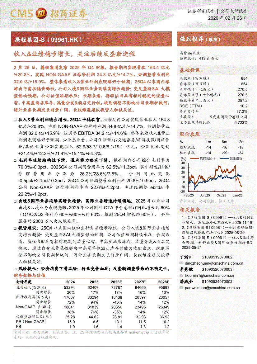 携程集团~S:招商证券-携程集团~S-9961.HK-收入&业绩稳步增长,关注后续反垄断进程-260226