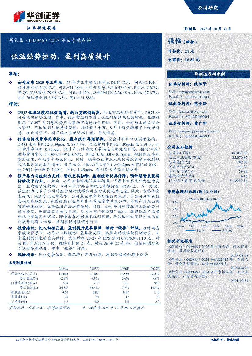 新乳业:华创证券-新乳业-002946-2025年三季报点评:低温强势拉动,盈利高质提升-251030
