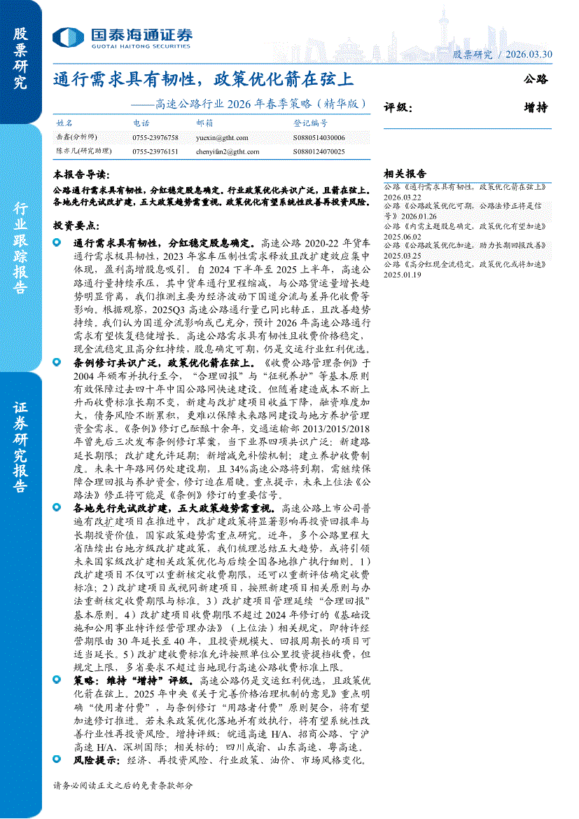 高速公路行业:国泰海通证券-高速公路行业2026年春季策略(精华版):通行需求具有韧性,政策优化箭在弦上-260330