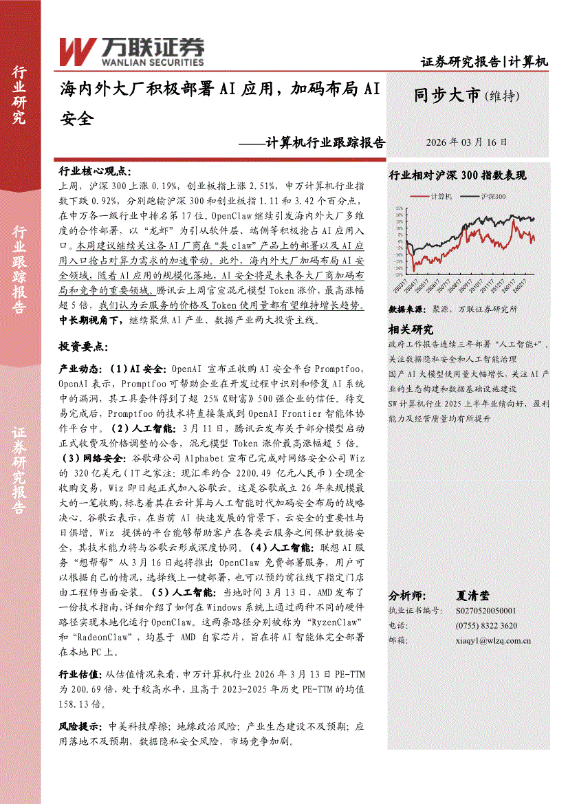 计算机行业:万联证券-计算机行业跟踪报告:海内外大厂积极部署AI应用,加码布局AI安全-260316