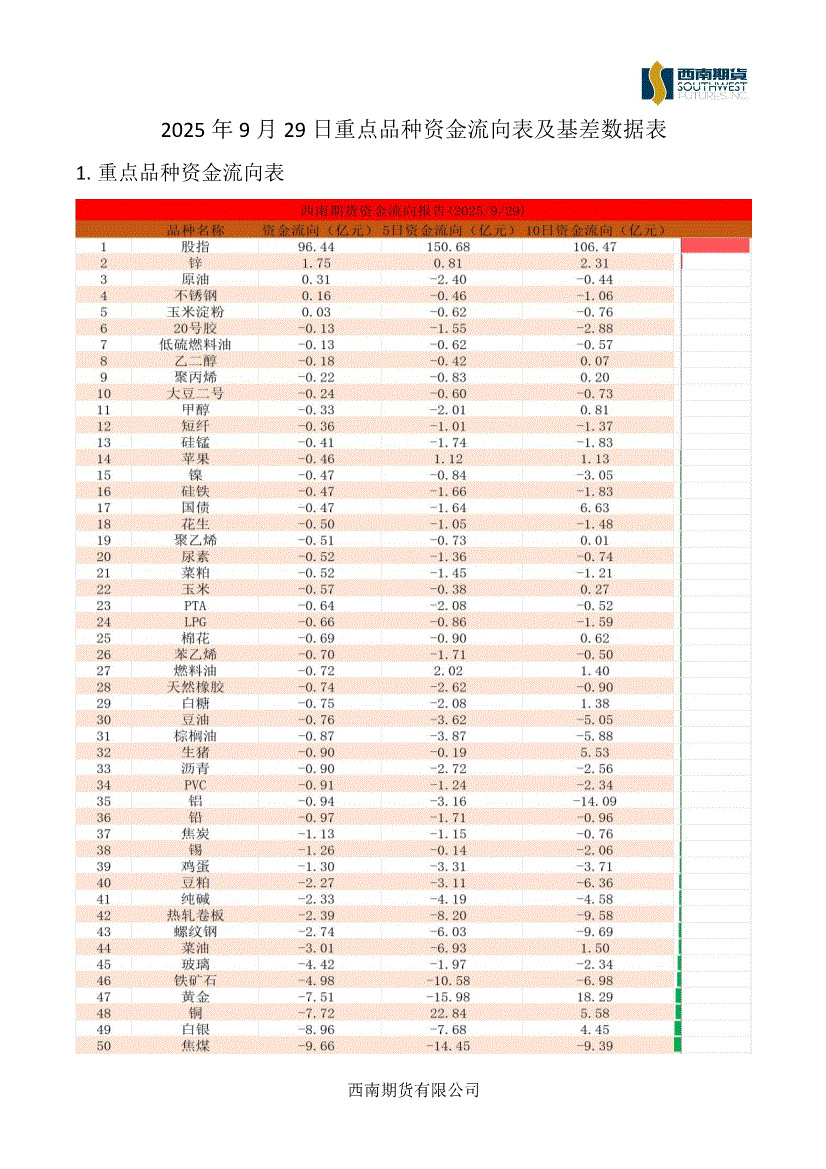西南期货-2025年9月29日重点品种资金流向表及基差数据表-250929