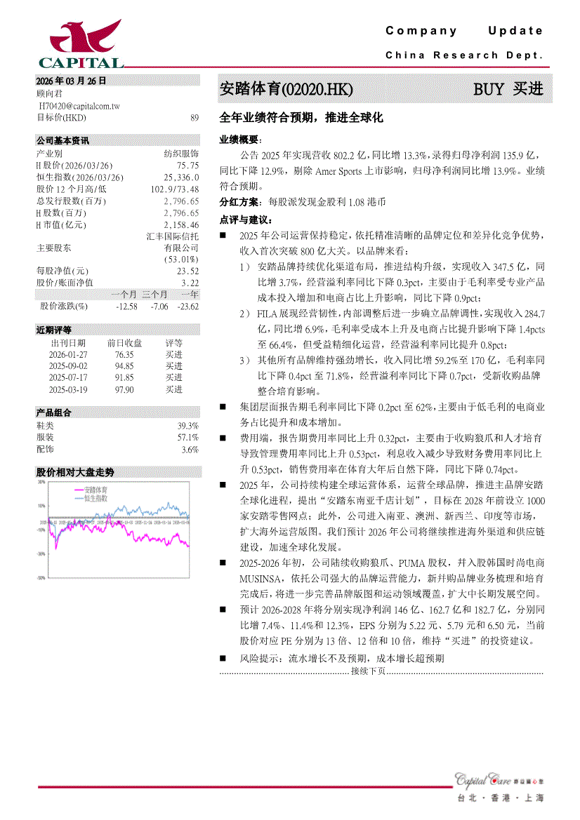 安踏体育:群益证券-安踏体育-2020.HK-全年业绩符合预期,推进全球化-260326