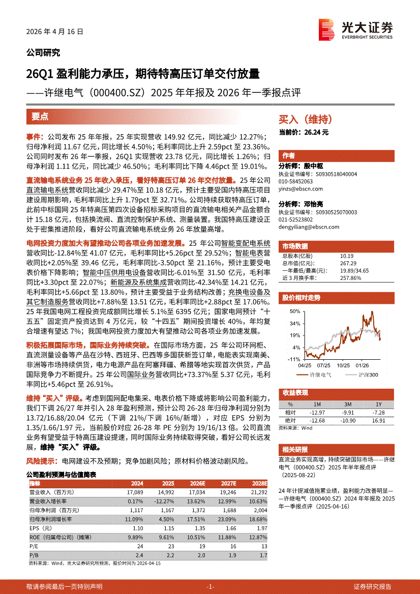 许继电气:光大证券-许继电气-000400-2025年年报及2026年一季报点评:26Q1盈利能力承压,期待特高压订单交付放量-260416