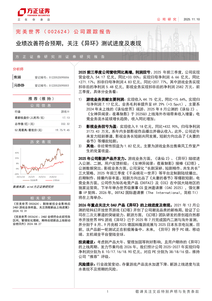 完美世界:方正证券-完美世界-002624-公司跟踪报告:业绩改善符合预期,关注《异环》测试进度及表现-251110
