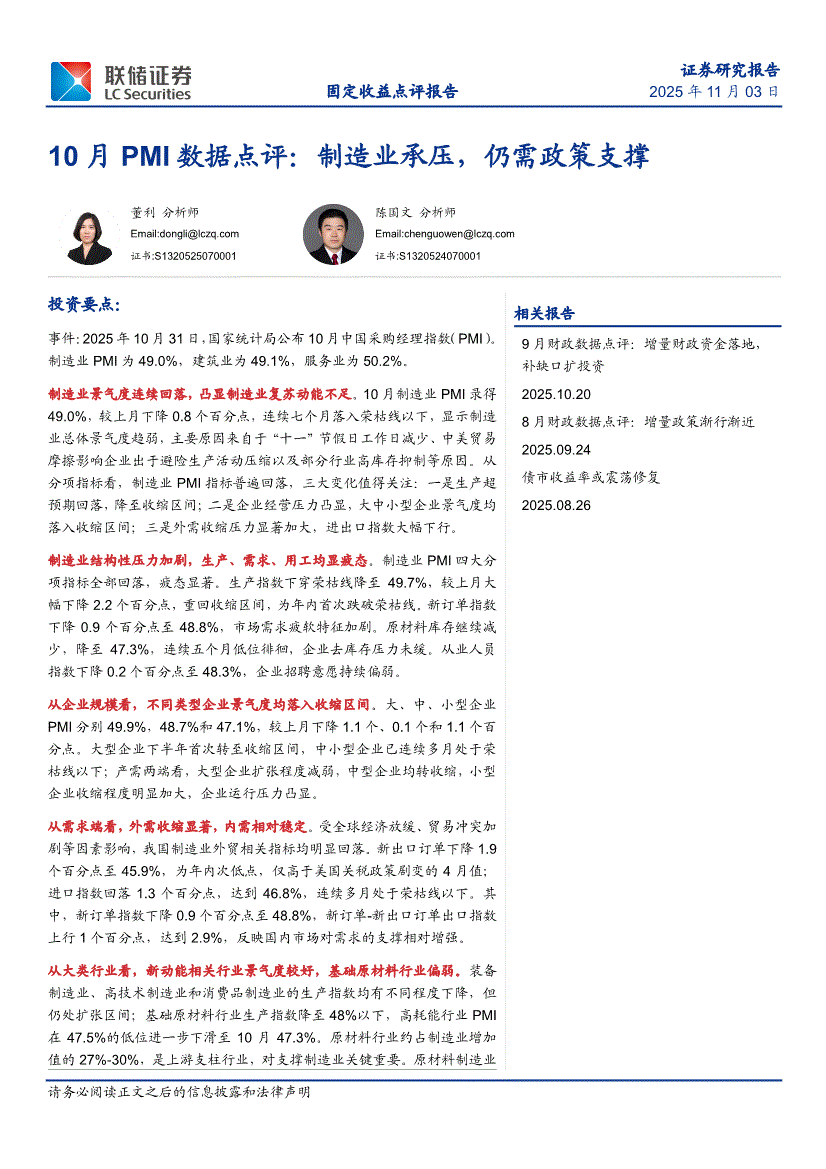 联储证券-10月PMI数据点评:制造业承压,仍需政策支撑-251103