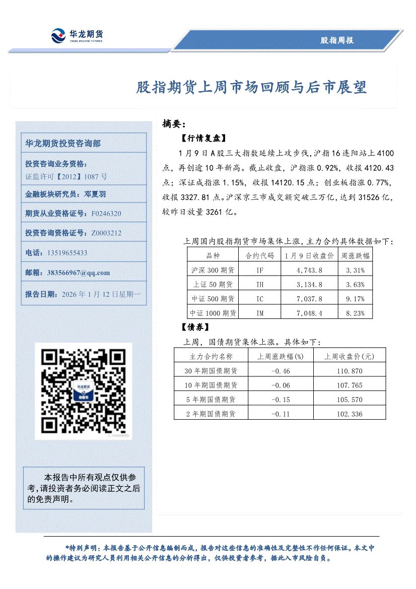 华龙期货-股指周报:股指期货上周市场回顾与后市展望-260112