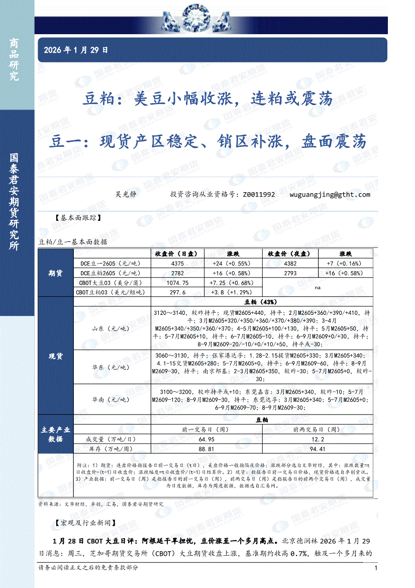 国泰君安期货-豆粕:或跟随美豆震荡,豆一,现货稳定,盘面反弹震荡-260126