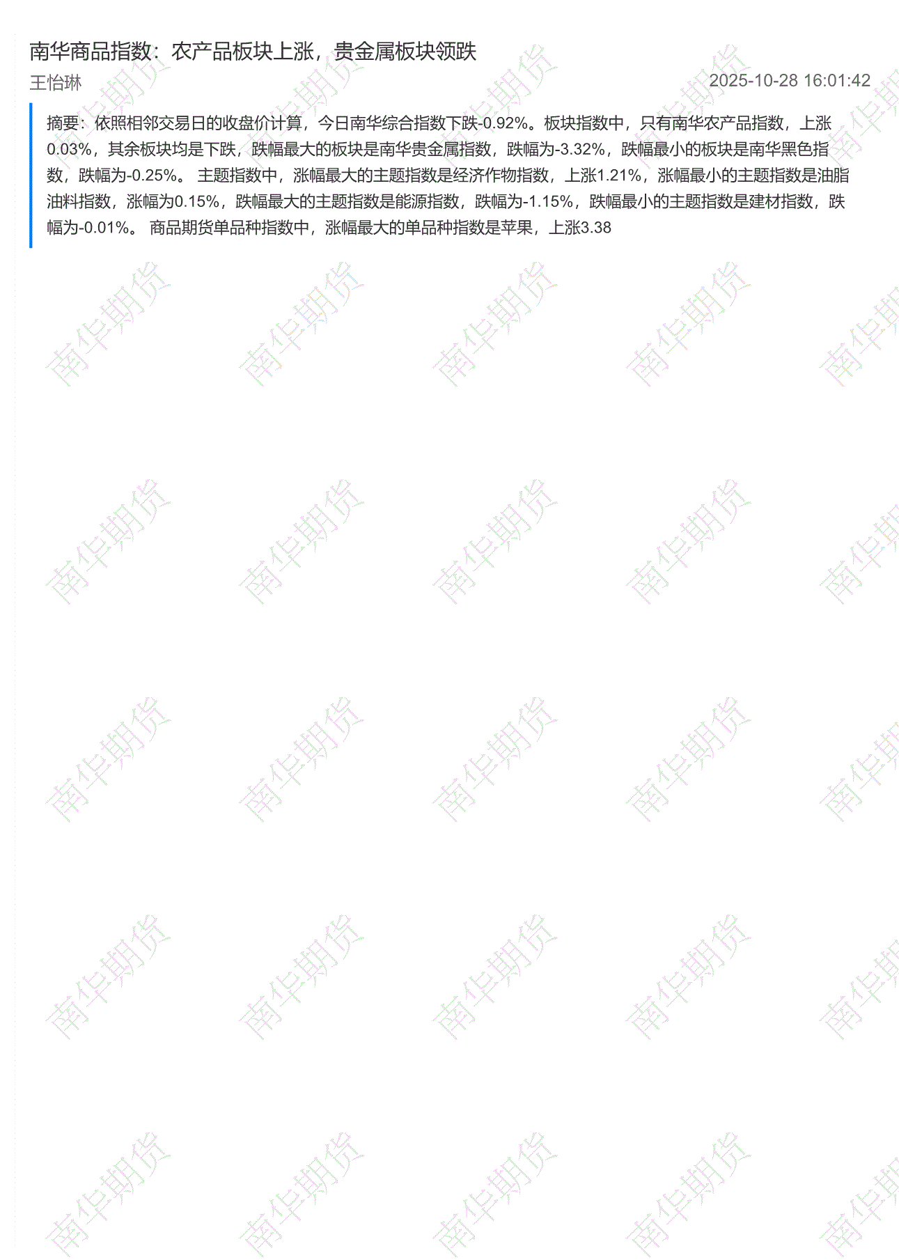 南华期货-南华商品指数:农产品板块上涨,贵金属板块领跌-251028