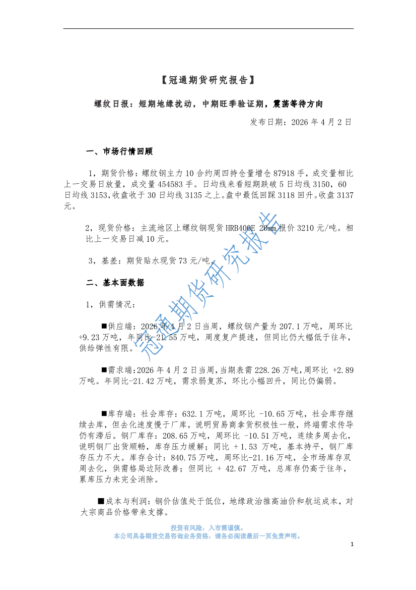 冠通期货-螺纹日报:短期地缘扰动,中期旺季验证期,震荡等待方向-260402