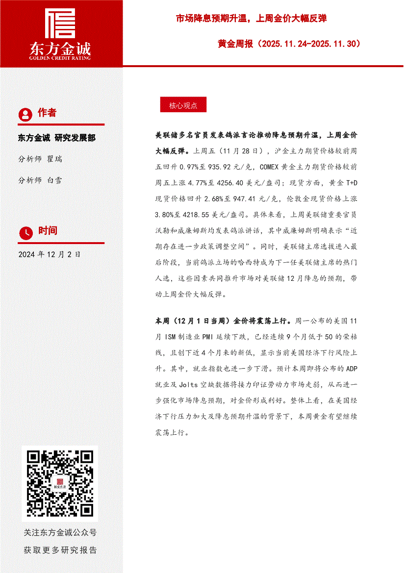 东方金诚-黄金周报:市场降息预期升温,上周金价大幅反弹-251202