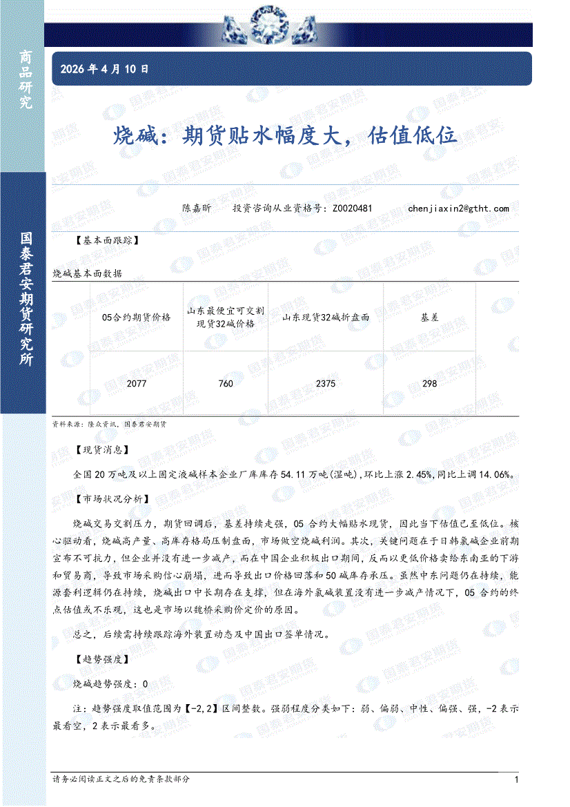 国泰君安期货-烧碱:期货贴水幅度大,估值低位-260410