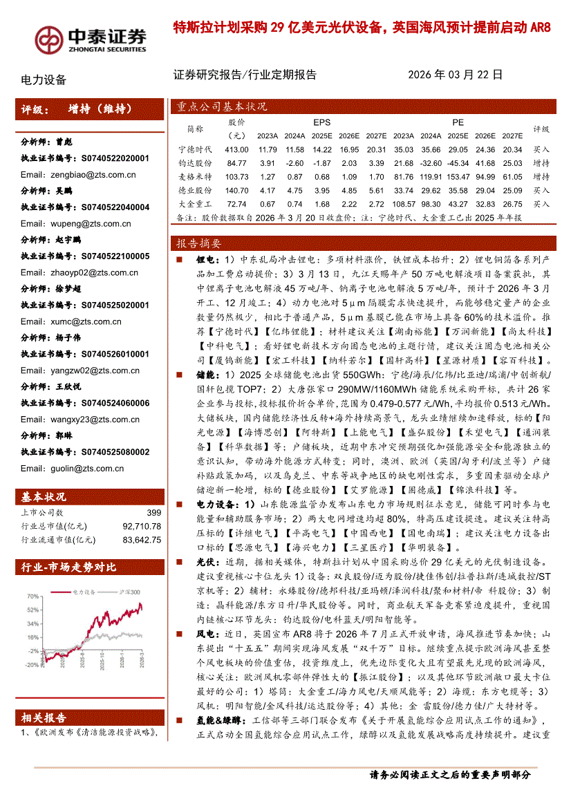 电力设备行业:中泰证券-电力设备行业:特斯拉计划采购29亿美元光伏设备,英国海风预计提前启动AR8-260322
