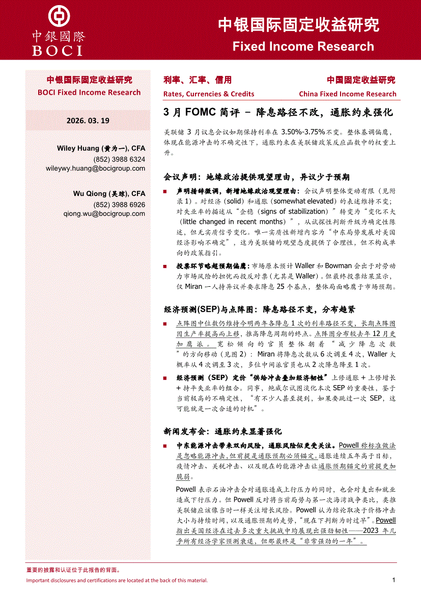 中银国际-3月FOMC简评:降息路径不改,通胀约束强化-260319