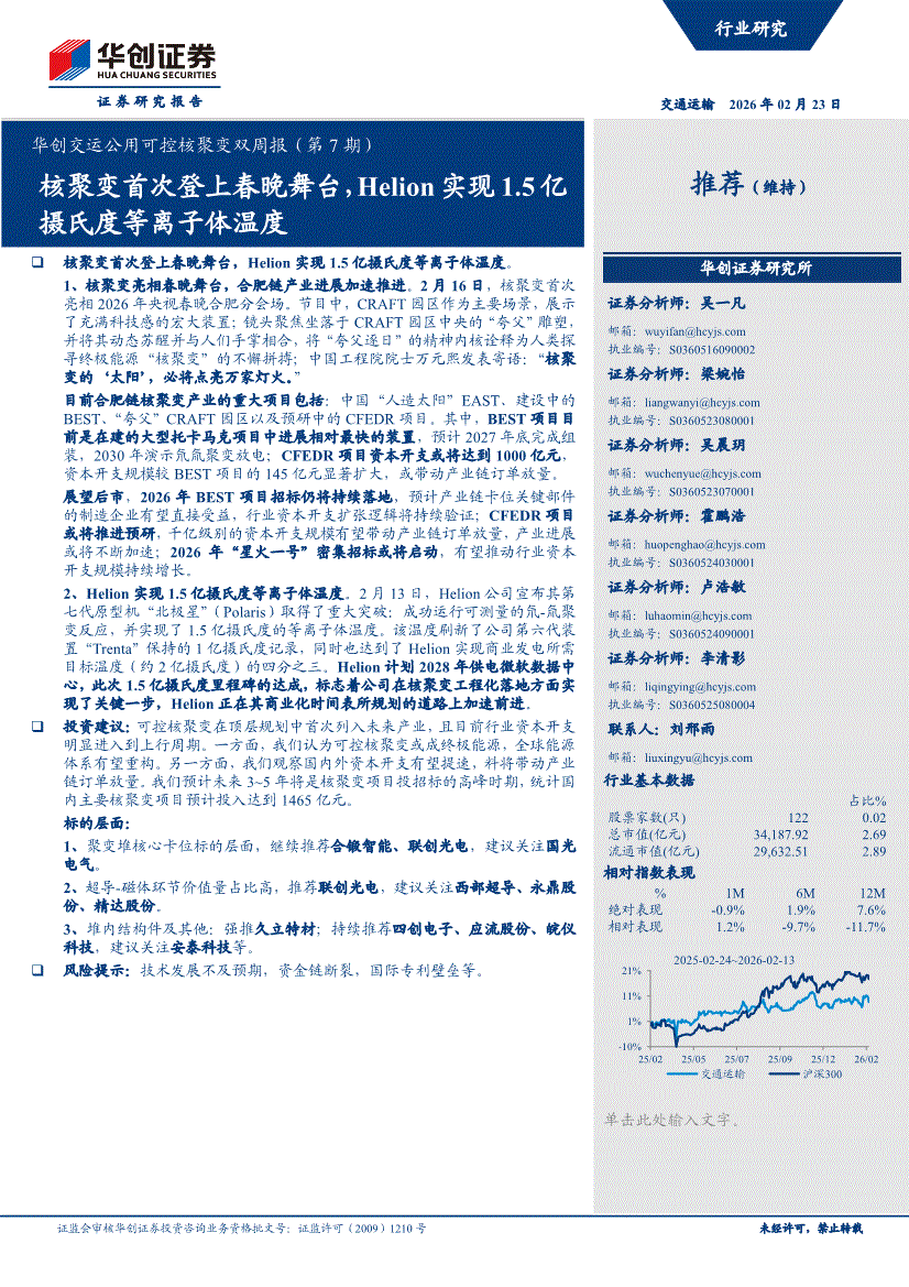 交通运输行业:华创证券-交通运输行业华创交运公用可控核聚变双周报(第7期):核聚变首次登上春晚舞台,Helion实现1.5亿摄氏度等离子体温度-260223