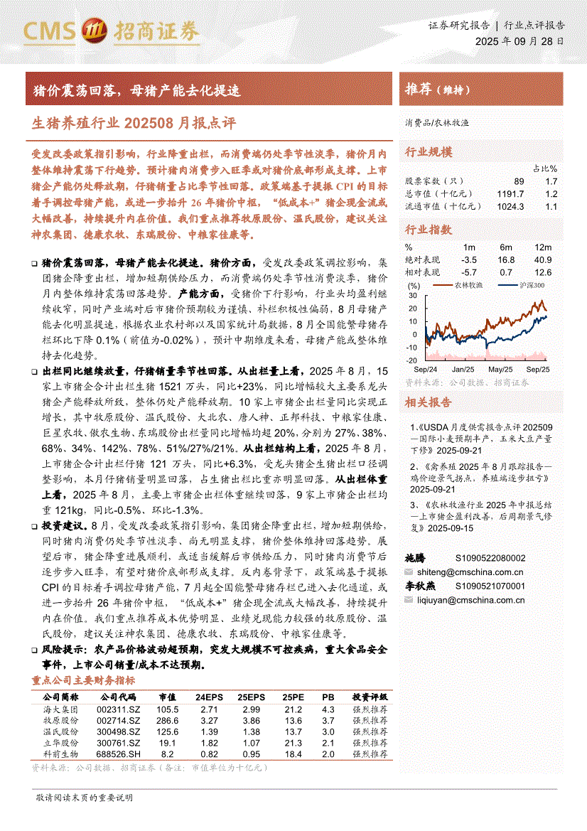 生猪养殖行业:招商证券-生猪养殖行业202508月报点评:猪价震荡回落,母猪产能去化提速-250928