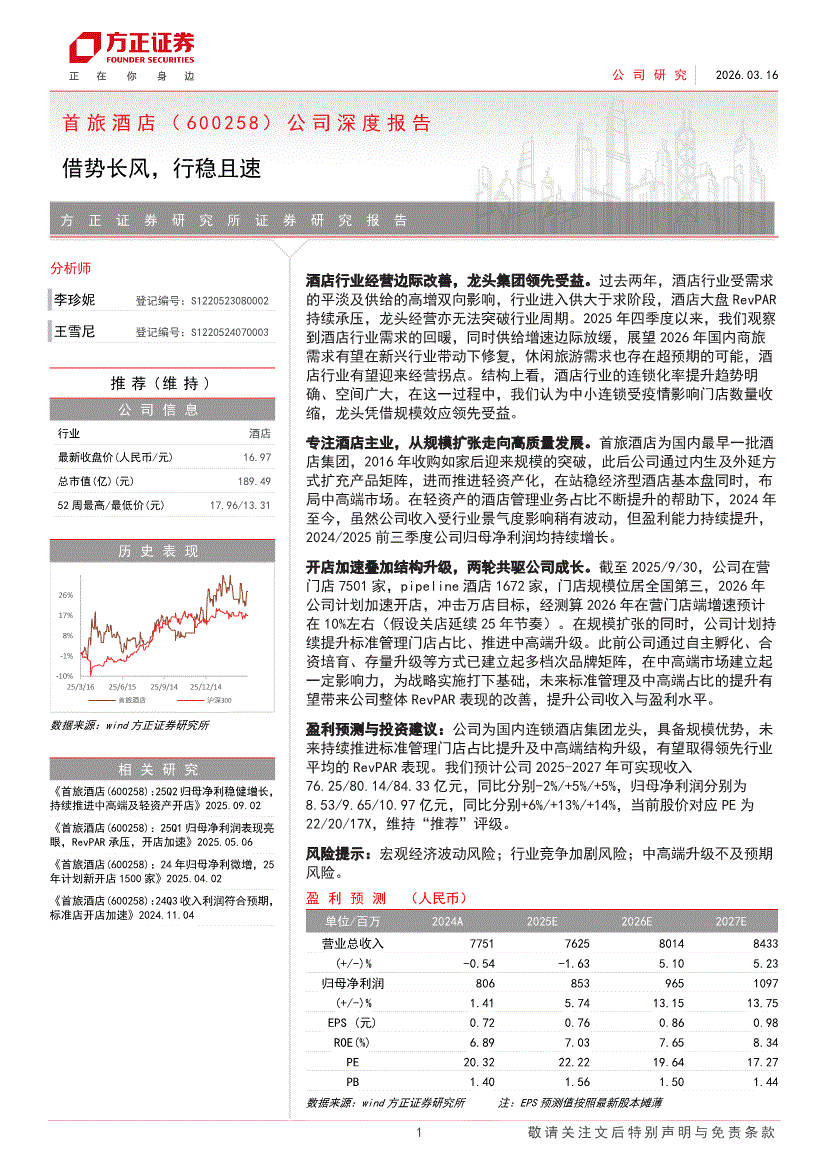 首旅酒店:方正证券-首旅酒店-600258-公司深度报告:借势长风,行稳且速-260316
