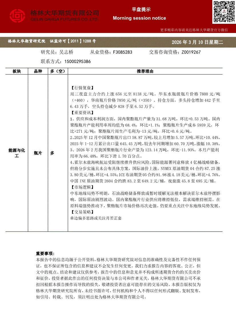 格林大华期货-早盘提示:瓶片-260310