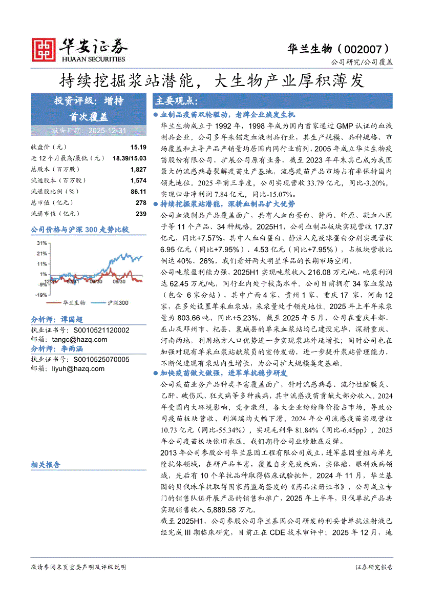 华兰生物:华安证券-华兰生物-002007-持续挖掘浆站潜能,大生物产业厚积薄发-251231