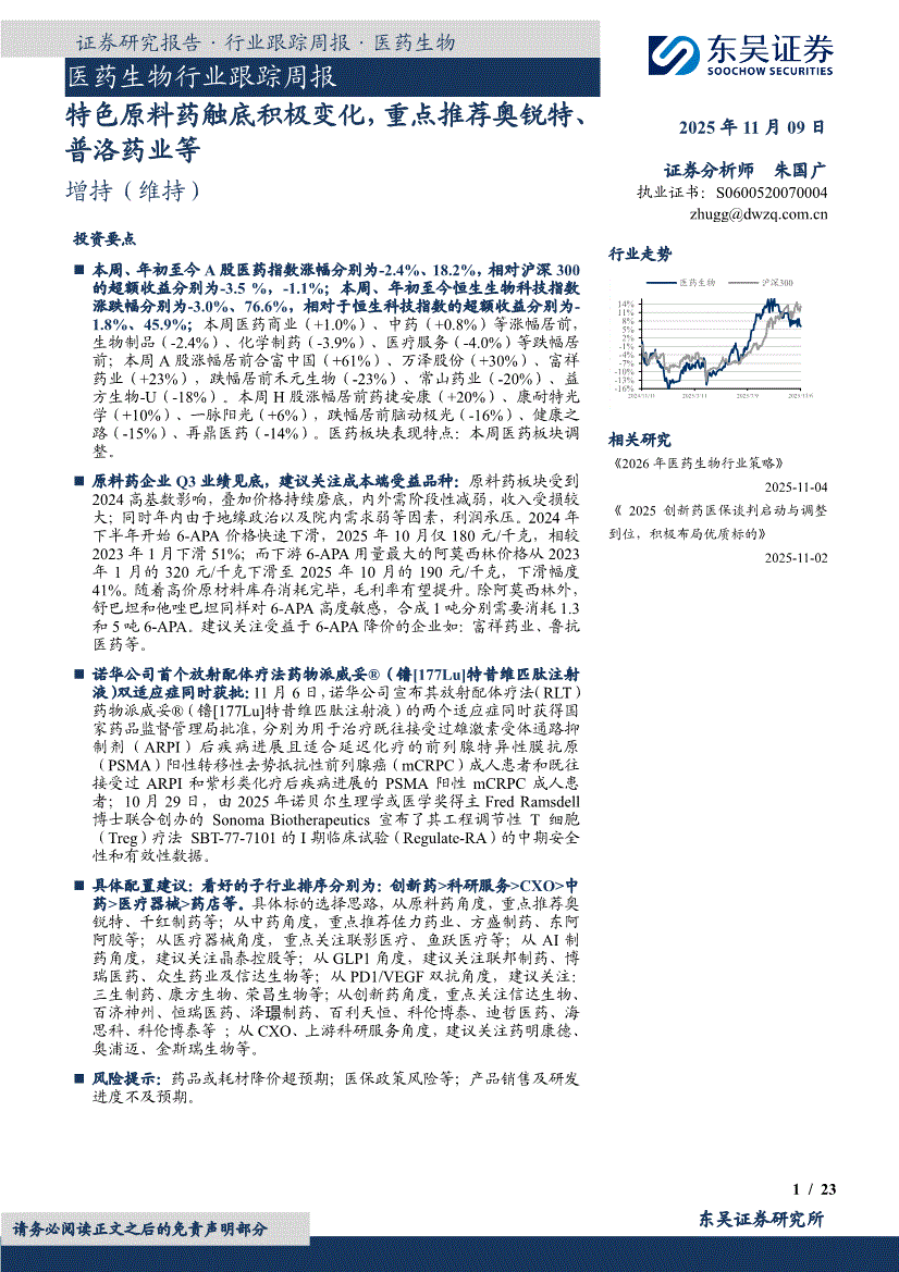 医药生物行业:东吴证券-医药生物行业跟踪周报:特色原料药触底积极变化,重点推荐奥锐特、普洛药业等-251109