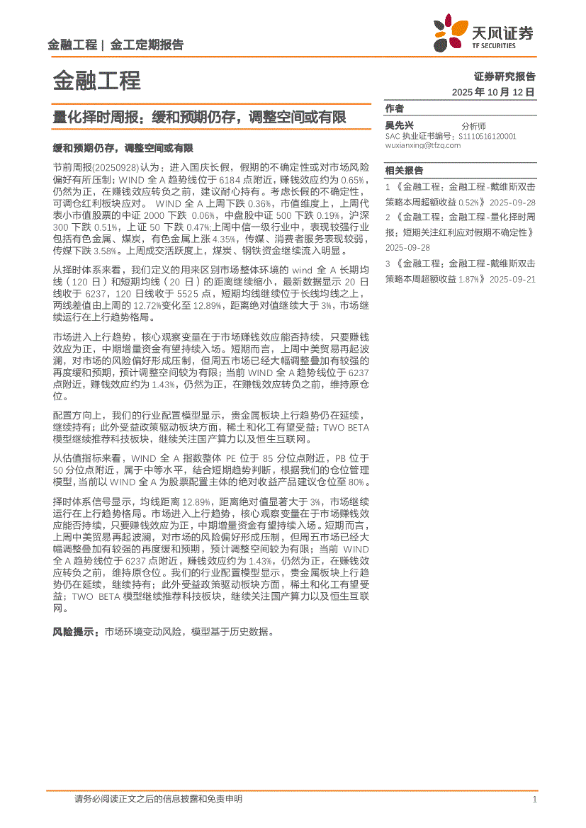 天风证券-量化择时周报:缓和预期仍存,调整空间或有限-251012