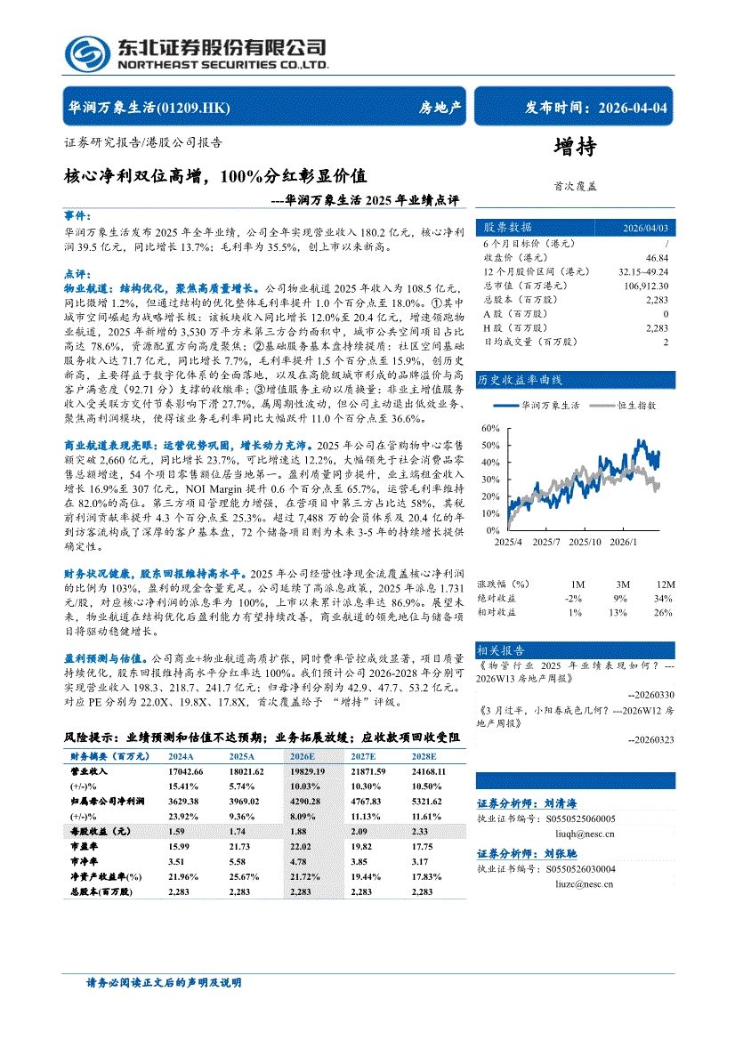 华润万象生活:东北证券-华润万象生活-1209.HK-2025年业绩点评:核心净利双位高增,100%分红彰显价值-260404