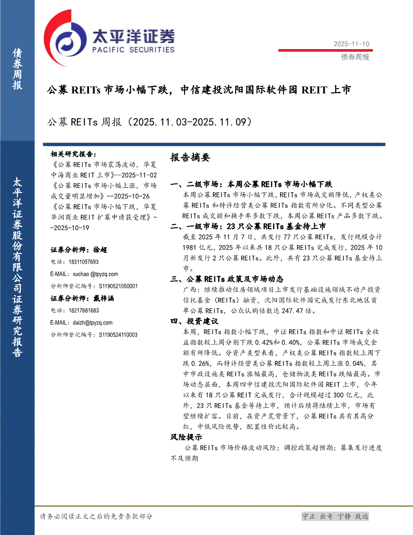 太平洋证券-公募REITs周报:公募REITs市场小幅下跌,中信建投沈阳国际软件园REIT上市-251110