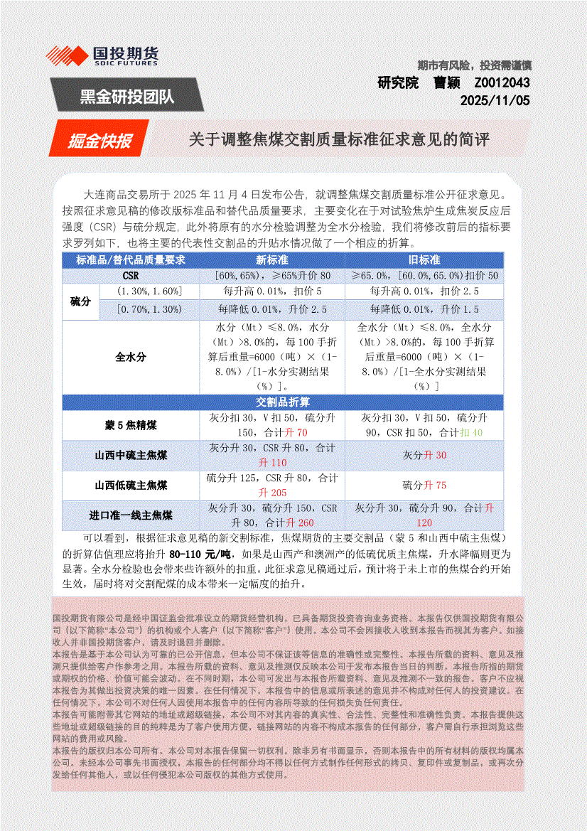 国投期货-掘金快报:关于调整焦煤交割质量标准征求意见的简评-251105