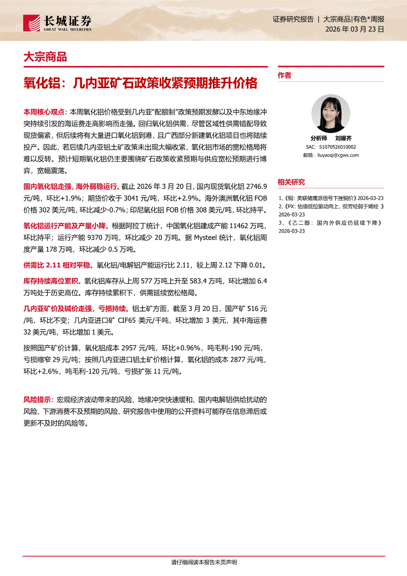 长城证券-大宗商品:氧化铝,几内亚矿石政策收紧预期推升价格-260323