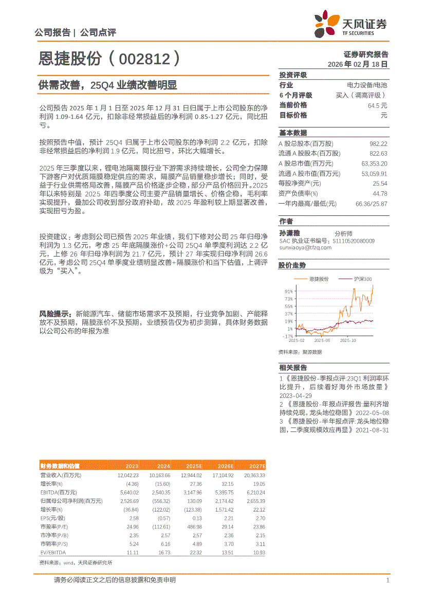 恩捷股份:天风证券-恩捷股份-002812-供需改善,25Q4业绩改善明显-260218